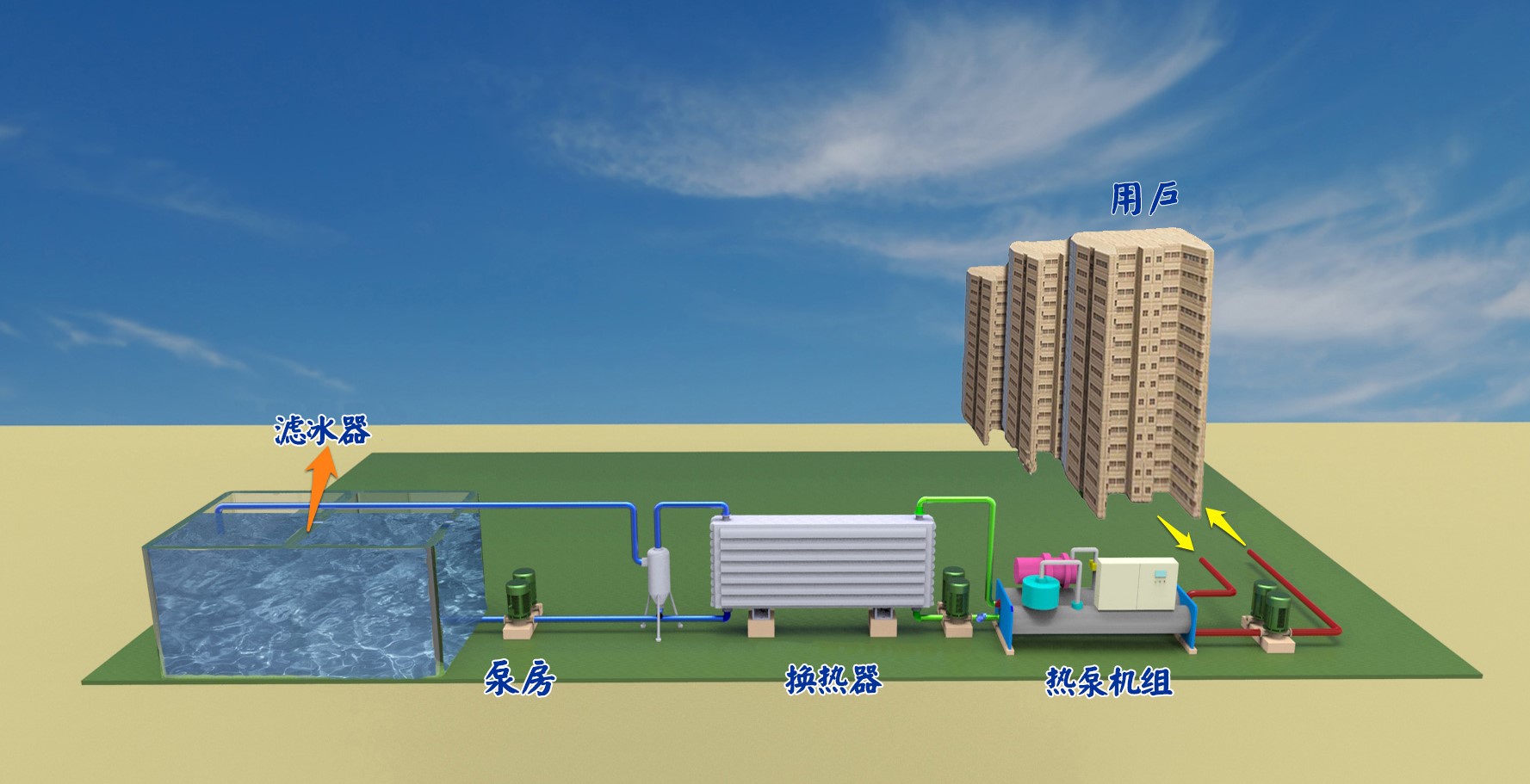 3.  Terminal water cycle: 40terminal water enters the heat pump unit, absorbs heat to rise to 50 degrees, and then enter the user building through the pipeline.