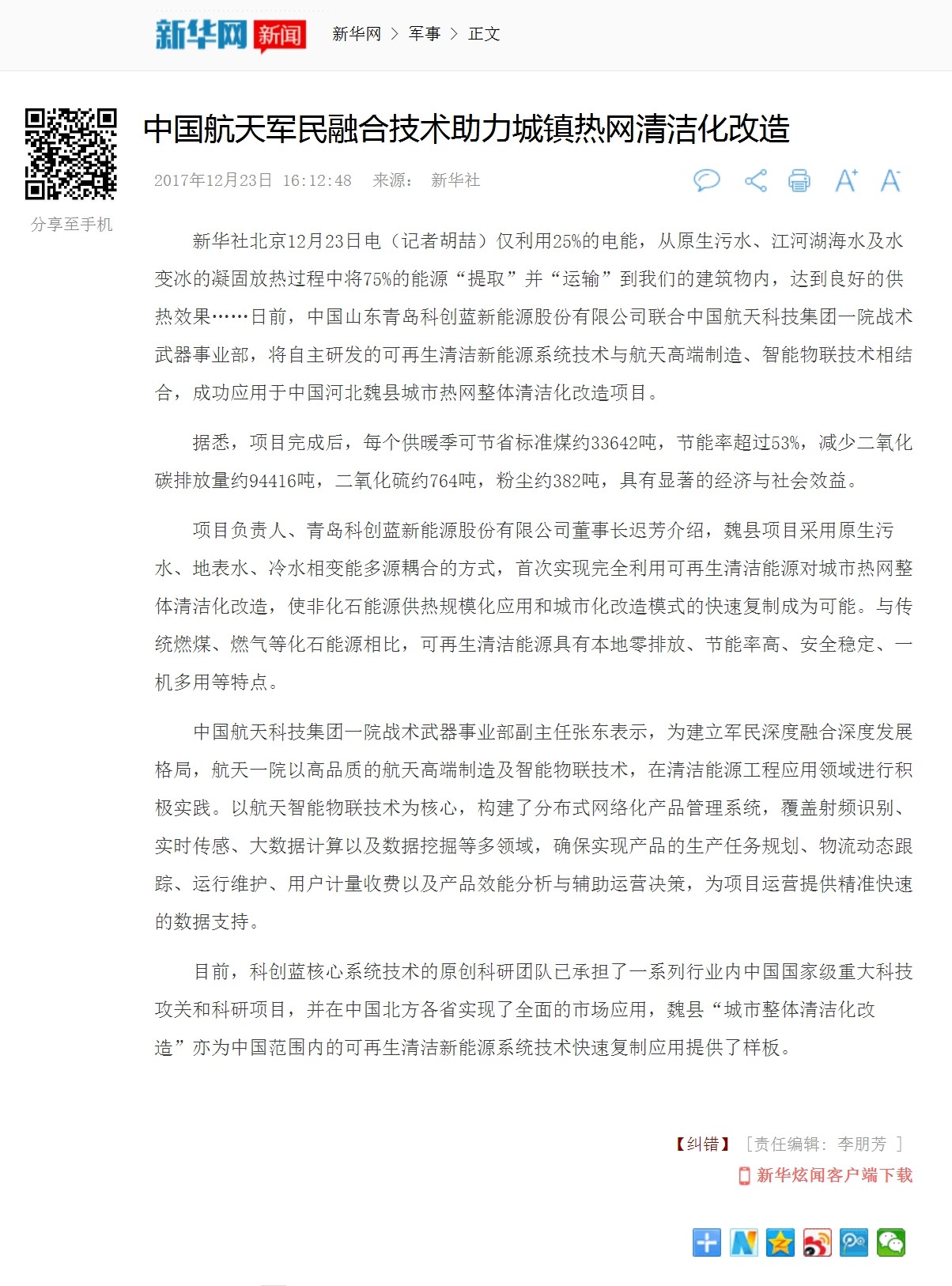 中國航天軍民融合技術助力城鎮(zhèn)熱網(wǎng)清潔化改造